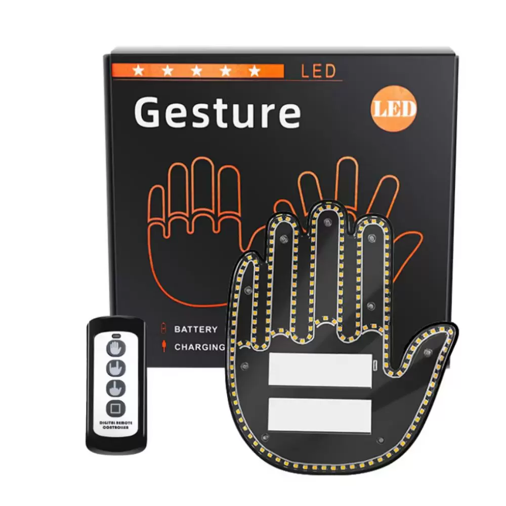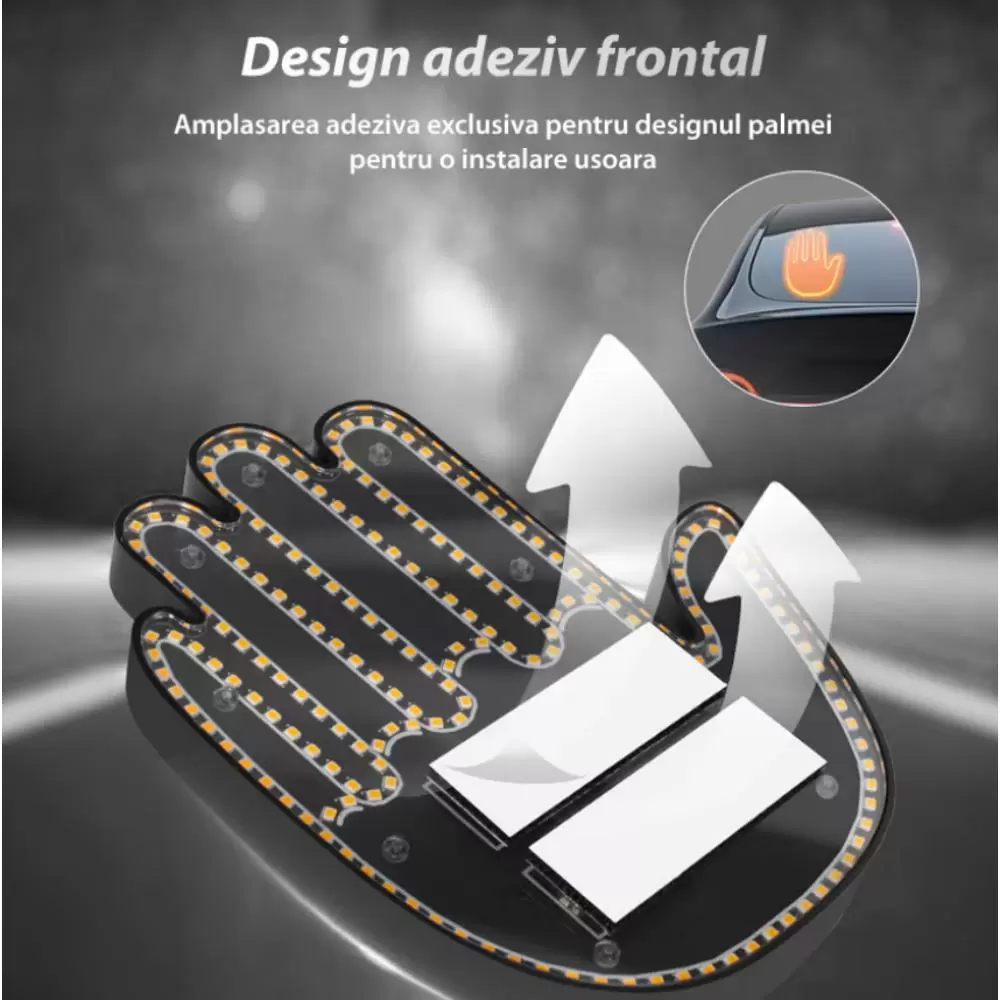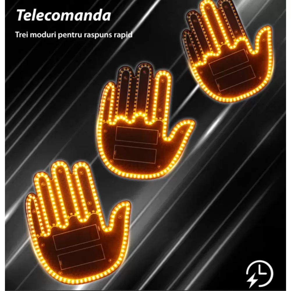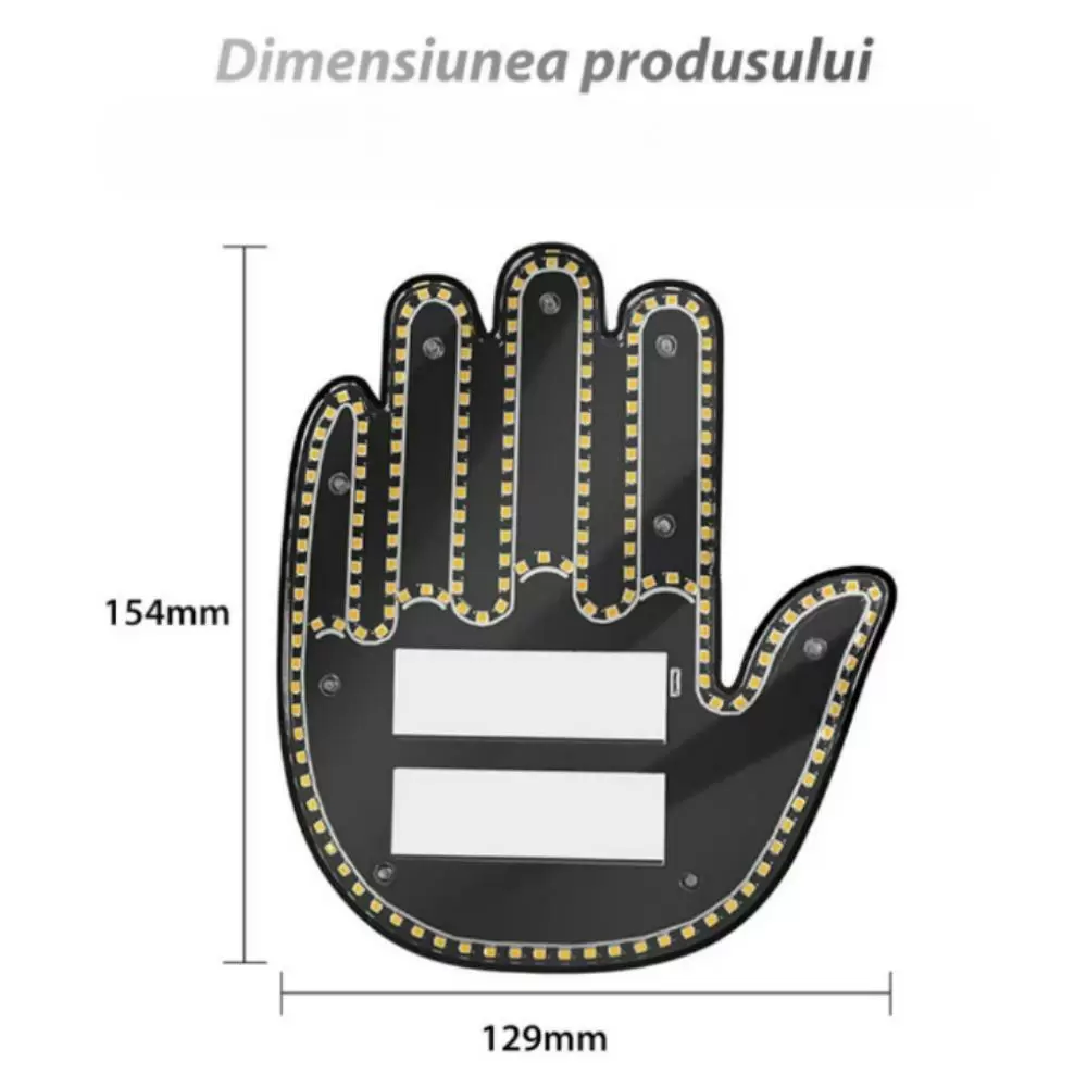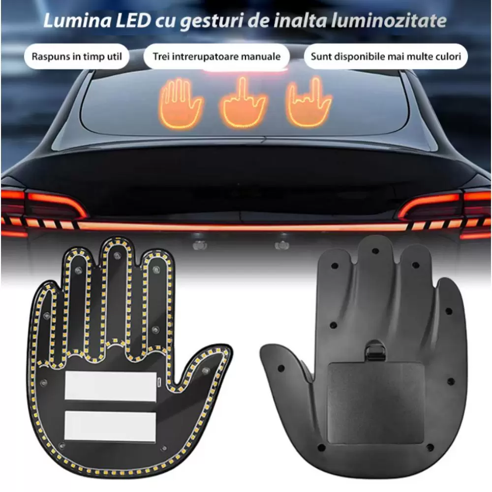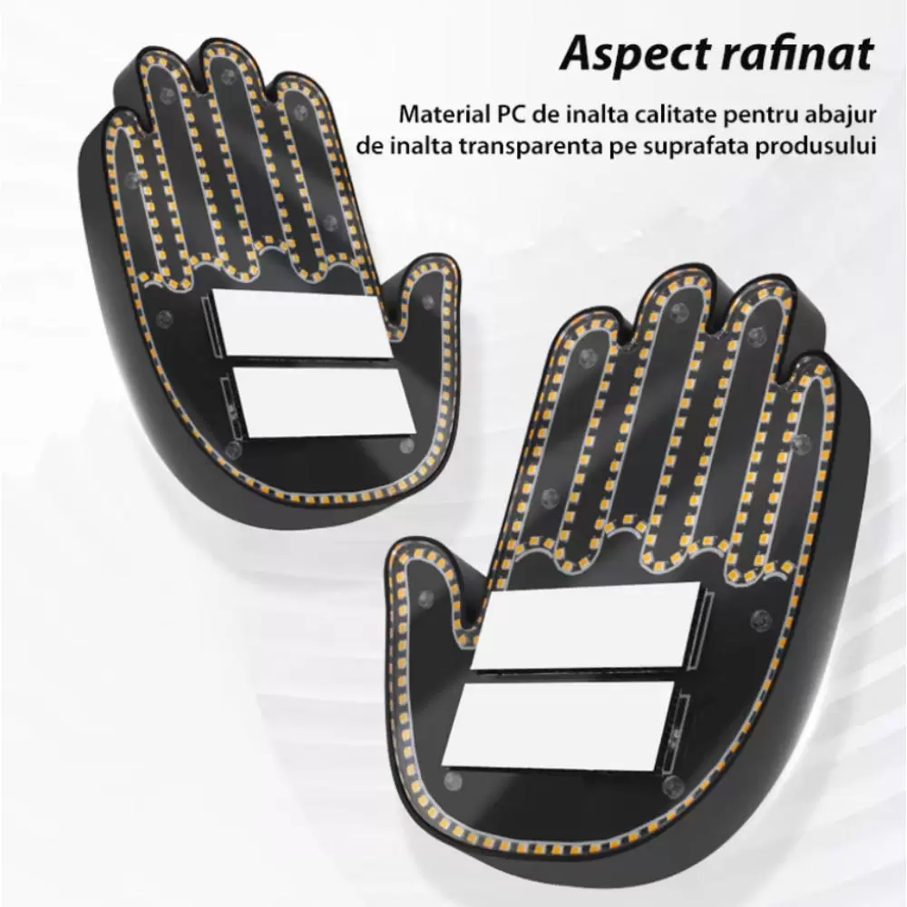 Semnul led pentru masina are un design cu o mana completa, efect de lumina in forma de gest cu mana, cu o culoare portocalie atragatoare, asigurand o vizibilitate maxima si un efect care capteaza atentia. Efectul de lumina in forma de gest cu mana adauga o nota de umor si o atitudine jucausa permitandu-ti sa-ti exprimi personalitatea unica pe drum.